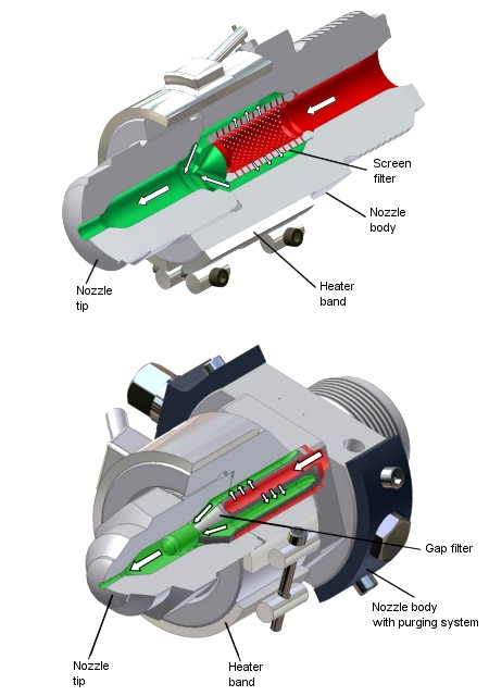 Herzog开发的过滤器设计紧凑, 经久耐用,可以在非常短的时间里完成组装并投入使用。Herzog标准的过滤喷嘴是基于多孔筛设计,相对于其他类型的过滤喷嘴, 注射压力损失更少。如果需要过滤间隙小于0.5mm的过滤器,我们会采用槽式设计。 带槽的过滤器还可以和我们独特的自动清洗装置一起使用,该清洗装置不需要把喷嘴从机器上拆除下来而直接进行异物冲洗。